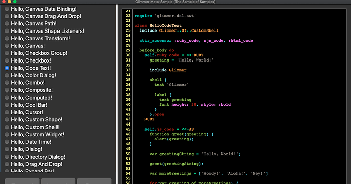 In Glimmer DSL for SWT v4.24.2.2, the `code_text` custom widget, which